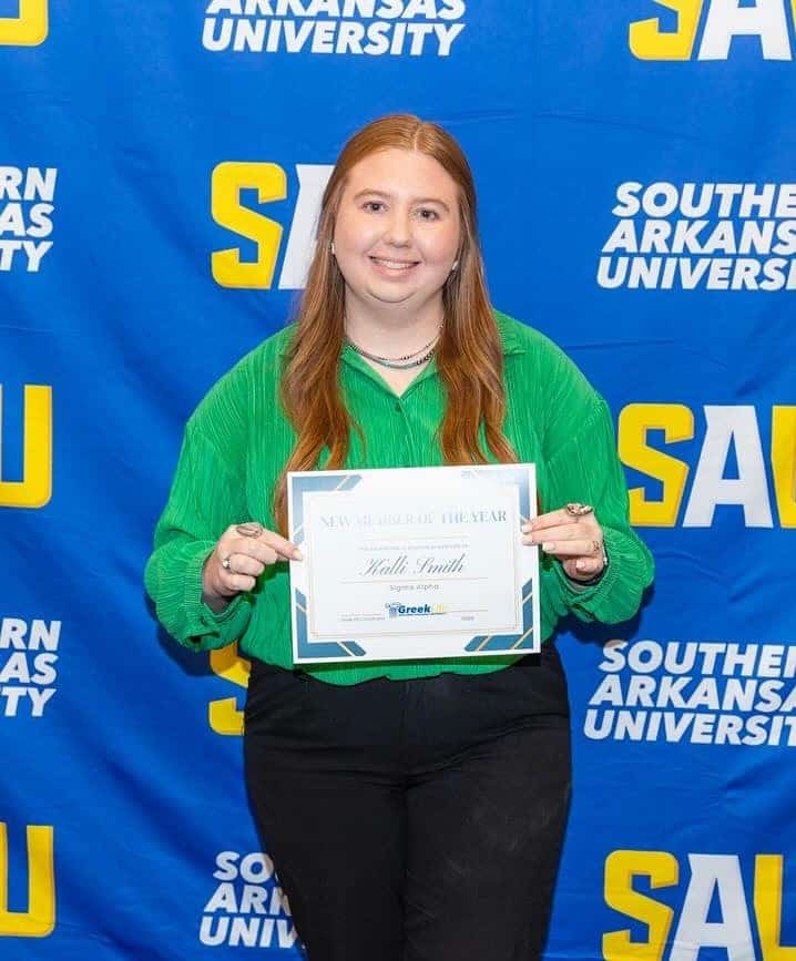 Kalli will graduate in Spring 2026 with a bachelor’s degree in agricultural business. She plans to obtain her master’s degree and become a professor of agricultural business. During her time at SAU, she has been a member of the Cattleman’s Association, Collegiate Farm Bureau, Future Farmers of America (FFA), and Sigma Alpha sorority.